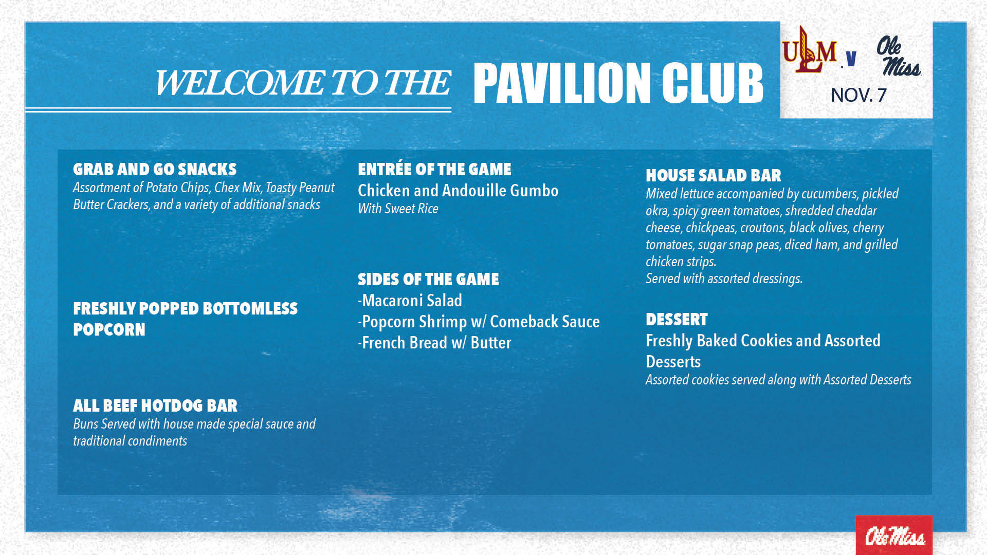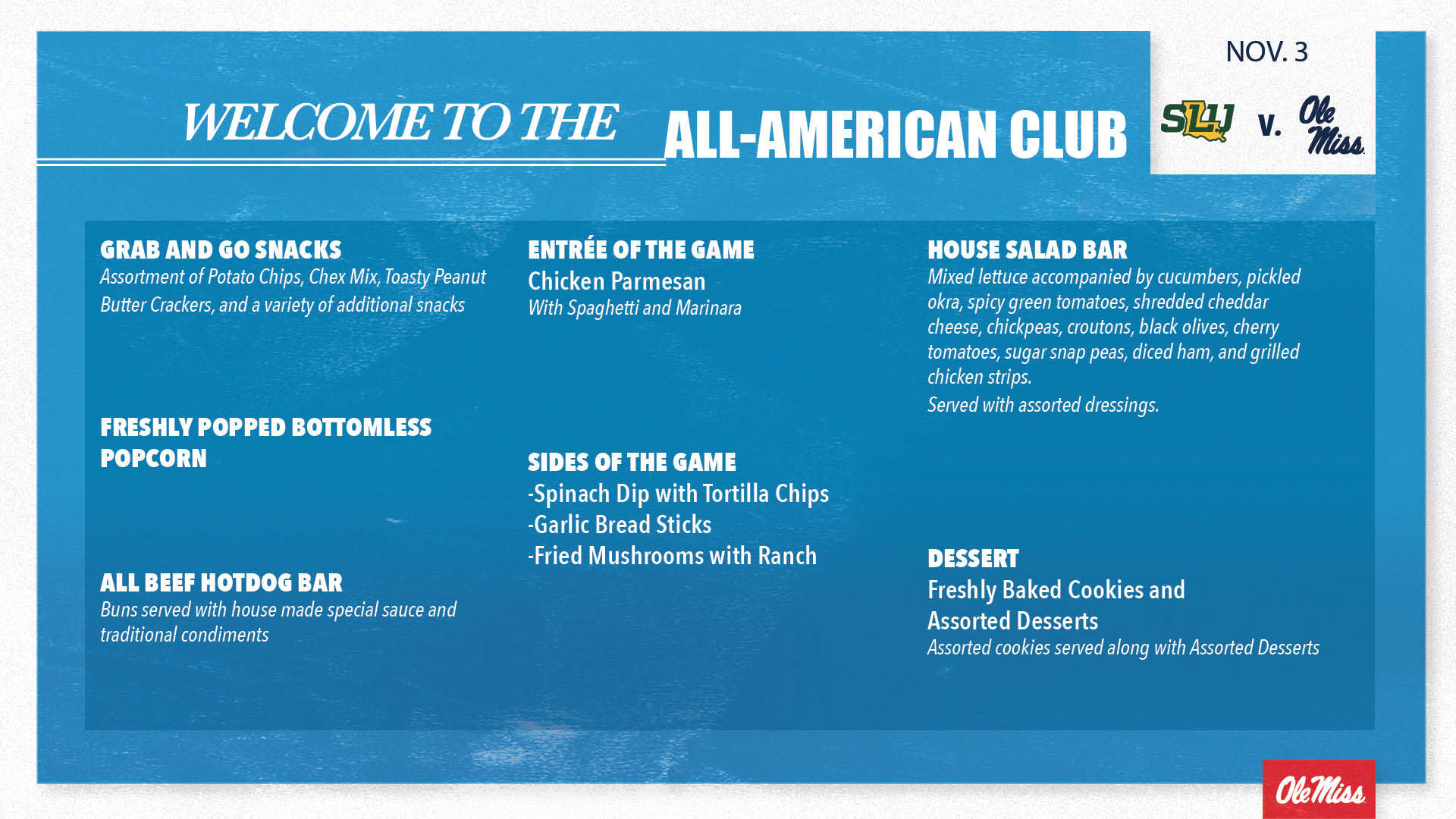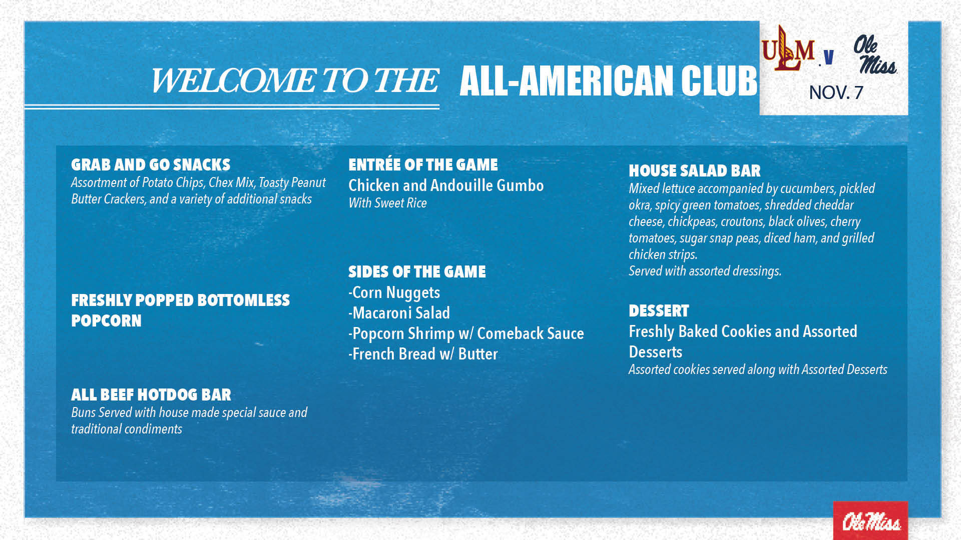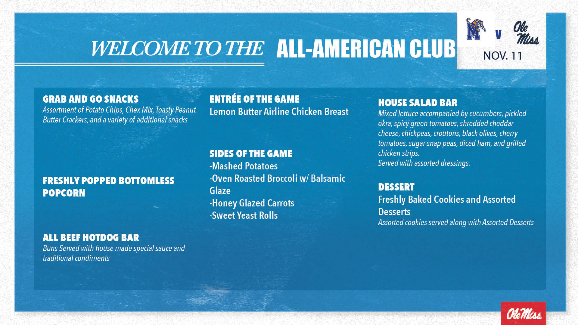 Located at the top of the lower bowl across from the Pavilion Club, the All-American Club will provide exclusive amenities to go along with a private box area. These seats will offer the best access to amenities and locker space and is the perfect way to experience Ole Miss Basketball. Members who have an All-American Club CGA will also have access to premium parking.