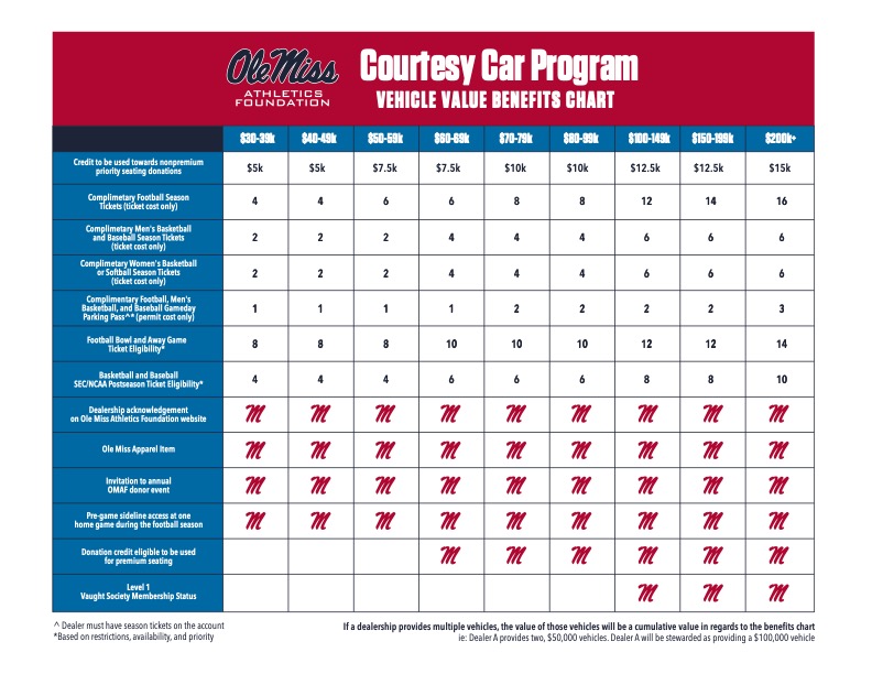 The Ole Miss Athletics Foundation operates a courtesy car program that helps offset costs incurred by providing vehicles for the use of athletics administrators and coaches. Auto dealers donate the use of cars to departmental staff members and in return receive certain designated benefits through the Ole Miss Athletics Foundation. Vehicles to be donated to the program must meet certain specifications to be accepted into the courtesy car program. Benefit levels will be determined by the type of car donated to the program by that dealer or donor. The program is coordinated through the Ole Miss Athletics Foundation with the equitable distribution of courtesy cars to coaches and administrators.